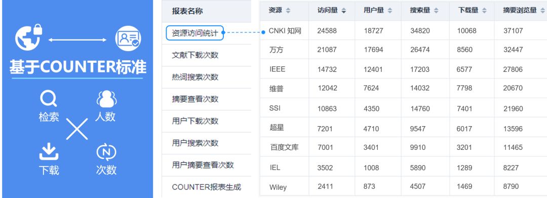 本系統(tǒng)按照COUNTER國際標(biāo)準(zhǔn)對(duì)用戶數(shù)據(jù)進(jìn)行統(tǒng)計(jì)分析,內(nèi)置多個(gè)電子資源統(tǒng)計(jì)模板,可精確統(tǒng)計(jì)用戶電子資源檢索及下載。