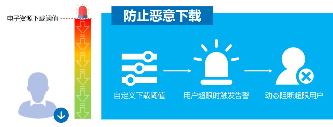 本系統(tǒng)支持自定義用戶電子資源下載閾值,當(dāng)用戶超限時(shí)觸發(fā)告警,通知管理員的同時(shí)自動(dòng)阻斷該用戶繼續(xù)訪問。本系統(tǒng)也支持自定義超限用戶禁止訪問的時(shí)長。