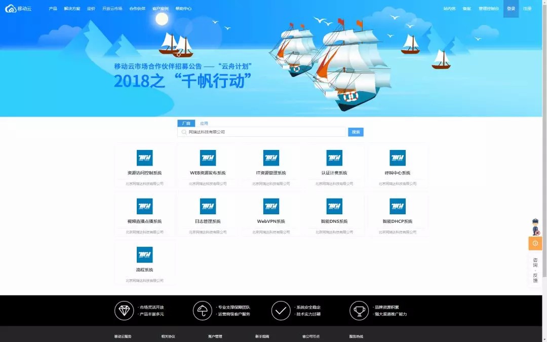 網(wǎng)瑞達結(jié)合市場特點及企業(yè)上云熱點,全方位擴展?fàn)I銷渠道,精選11大IT運維管理系統(tǒng),通過了層層篩選與專家考核,成功入駐移動云的開放云市場。