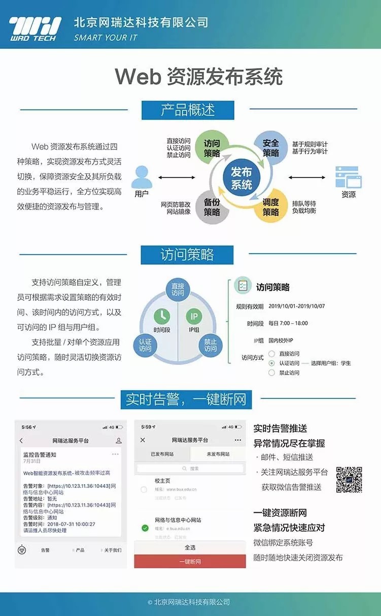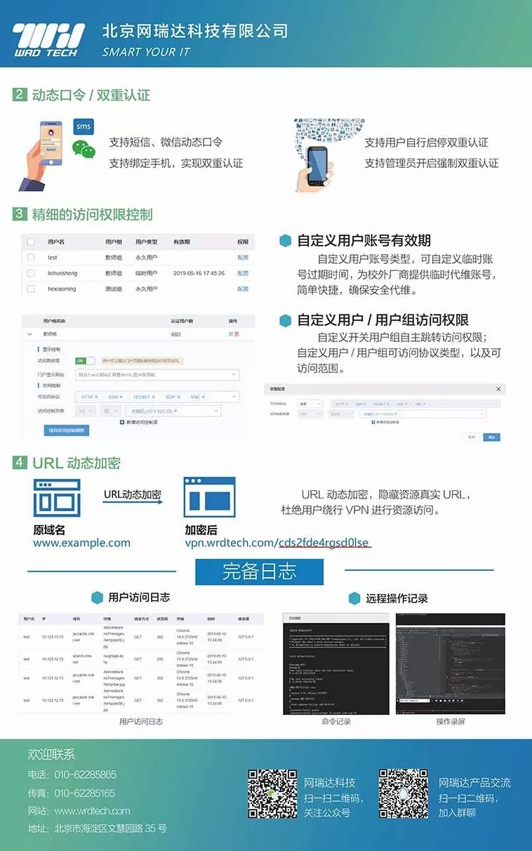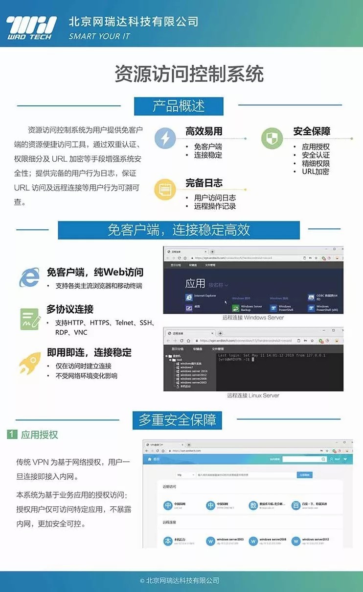資源訪問控制系統(tǒng)為用戶提供免客戶端的資源便捷訪問工具,通過雙重認證、權(quán)限細分及URL加密等手段增強系統(tǒng)安全性;提供完備的用戶行為日志,保證URL訪問及遠程連接等用戶行為可溯可查。